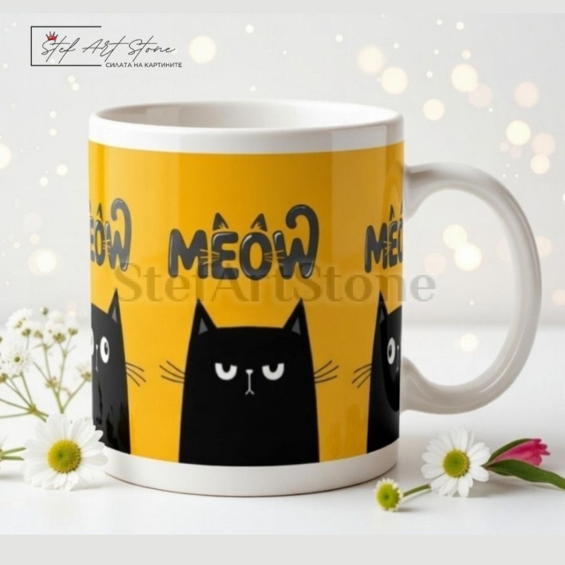 Дизайнът е изключително атрактивен – на ярък жълт фон се откроява забавна илюстрация на черна котка с типично "недоволно" изражение, допълнена с категоричния надпис "MEOW". Нашите забавни чаши са създадени да носят страхотно настроение, а този модел гарантирано ще се превърне в най-коментираната чаша за кафе на работното място.