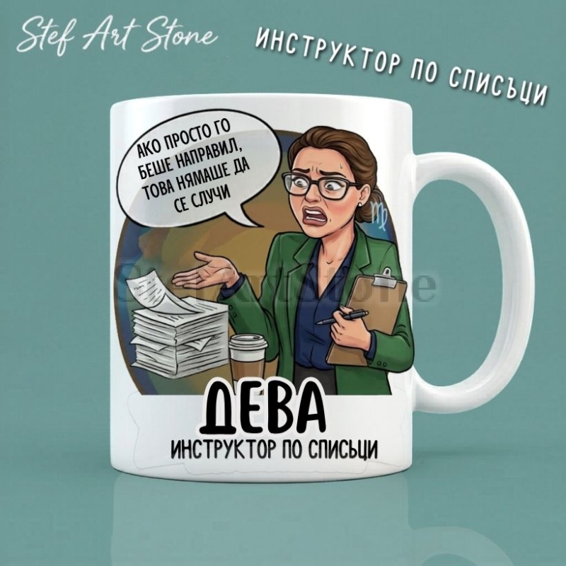 Жените от зодия Дева са безспорните кралици на организацията, детайла и перфектно изпълнения план. Те знаят как точно трябва да се случат нещата и хич не се страхуват да ви го кажат! Точно тази безкомпромисна и изключително забавна черта е уловена в нашата нова чаша за зодия Дева. Илюстрацията на леко изнервена, но безупречно подготвена дама с папка и планина от документи, съчетана с абсолютно класическата реплика "Ако просто го беше направил, това нямаше да се случи", превръща този модел в абсолютен хит. Това е един наистина оригинален подарък, който ще разсмее до сълзи всяка представителка на земния знак.
