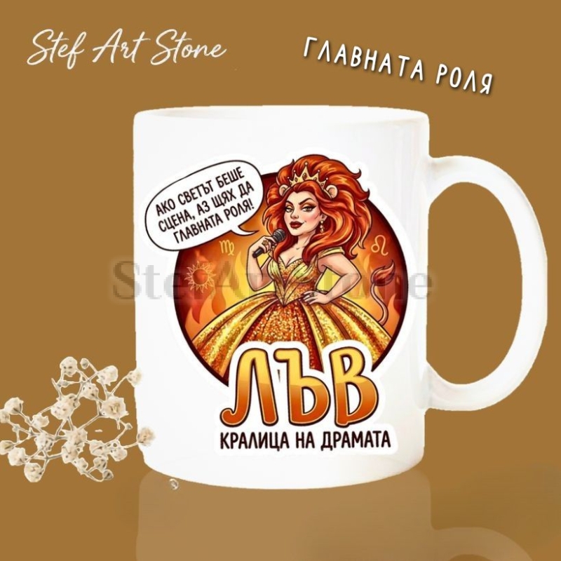 Лъвиците са истински звезди и светът е тяхната лична сцена! Нашата нова чаша за зодия Лъв е създадена специално за дамите, които обожават светлините на прожекторите и винаги обират овациите. Дизайнът с ослепителна жена в златна рокля, държаща микрофон, перфектно илюстрира тяхната артистична и драматична природа. Този оригинален подарък гарантирано ще накара всяка представителка на огнения знак да се почувства като истинска знаменитост още с първата глътка кафе.