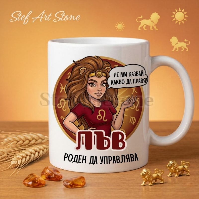 Жените от зодия Лъв имат вродена царствена осанка и категорично не обичат да им се дават наклонности в живота! Нашата нова чаша за зодия Лъв е създадена точно за тези силни, независими и уверени дами, които държат юздите в свои ръце. Дизайнът представя стилна жена с пищна прическа и непоколебим поглед, допълнена от изключително забавното и напълно вярно послание: Не ми казвай какво да правя!. Този модел е един наистина оригинален подарък, който ще предизвика много смях и гордо съгласие от всяка представителка на огнения знак.