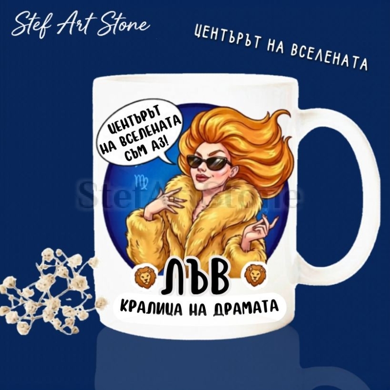 Представителките на зодия Лъв са родени да блестят и обожават вниманието! Нашата нова чаша за зодия Лъв е създадена точно за тези уверени дами, които превръщат всяко влизане в стаята в истинско събитие. Дизайнът с бляскава жена с обемна коса, слънчеви очила и пухкаво палто, съчетан с култовия надпис "Центърът на вселената съм аз!", е абсолютен шедьовър на хумора. Това е един наистина оригинален подарък, който ще накара всяка истинска кралица на драмата да се усмихне гордо и да потвърди: "Да, точно такава съм!".