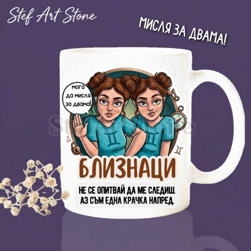 Чашата представя страхотна илюстрация на две момичета, символизиращи двойната ментална сила на зодията, допълнени с детайли като катинар, ключ и компас. Композицията е завършена от гениалните реплики: "МОГА ДА МИСЛЯ ЗА ДВАМА!" и предупредителното "БЛИЗНАЦИ – НЕ СЕ ОПИТВАЙ ДА МЕ СЛЕДИШ. АЗ СЪМ ЕДНА КРАЧКА НАПРЕД.". Това превръща артикула в идеалния подарък за всяка дама, която мрази бавните реакции, винаги има план и е подготвена за следващия ход.