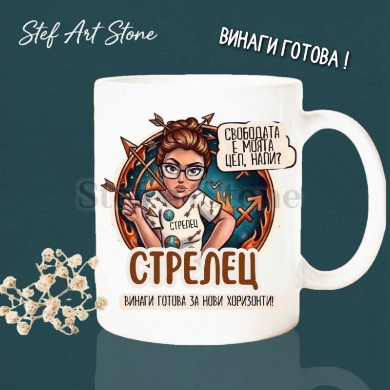 Чашата представя страхотна илюстрация на момиче с очила, чиято коса е прибрана с истински стрели, готови за употреба. Композицията е завършена от култовите реплики: "СВОБОДАТА Е МОЯТА ЦЕЛ, НАЛИ?" и "СТРЕЛЕЦ – ВИНАГИ ГОТОВА ЗА НОВИ ХОРИЗОНТИ!". Това превръща артикула в идеалния подарък за всяка дама, която мрази рутината, обожава независимостта си и винаги гледа напред към нови цели.