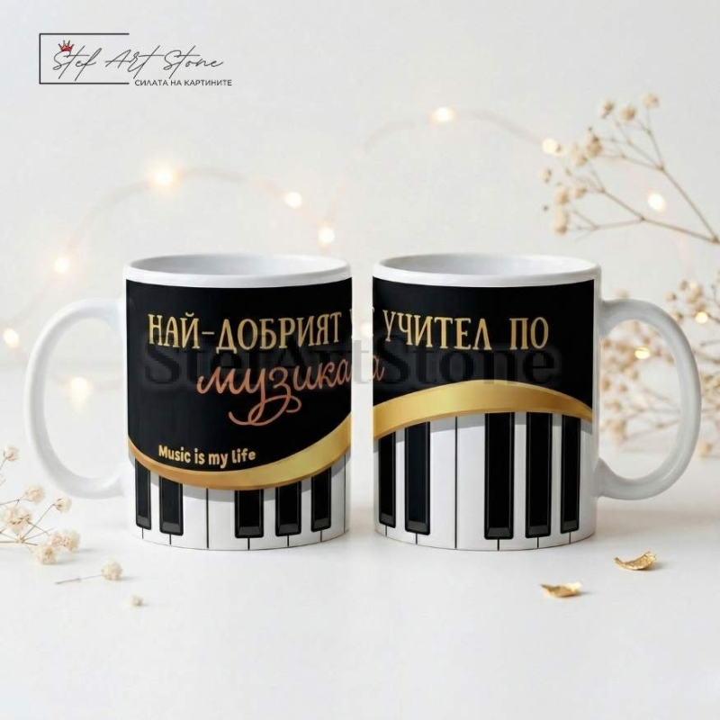 Дизайнът е създаден специално за хора на изкуството – класическа комбинация от черно, клавиши на пиано и изящна златна лента. Централно място заема посланието, което ще докосне сърцето на всеки педагог: "НАЙ-ДОБРИЯТ УЧИТЕЛ ПО музика". Нашите чаши за подарък са не просто красиви, но и практични, превръщайки се във верен спътник в междучасията или по време на дълги репетиции.