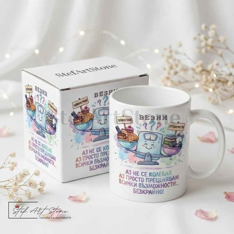 Висококачествена бяла керамична чаша (330 мл) за най-балансиращата зодия. Дизайнът показва симпатичен кантар, разкъсван между "Удоволствия" и "Отговорности", с култовия надпис: "АЗ НЕ СЕ КОЛЕБАЯ, АЗ ПРОСТО ПРЕЦЕНЯВАМ ВСИЧКИ ВЪЗМОЖНОСТИ... БЕЗКРАЙНО!".