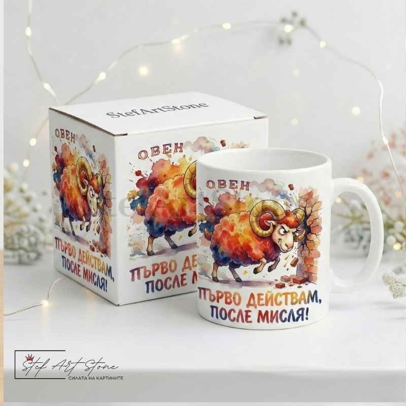 Чаша Зодия Овен – "Първо действам, после мисля!" (Забавен Подарък за Рожден Ден) С кутия