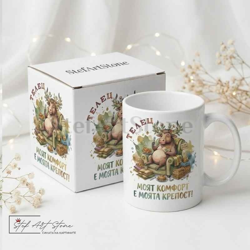 Чаша Зодия Телец – "Моят комфорт е моята крепост" (Забавен Подарък за Рожден Ден) С кутия
