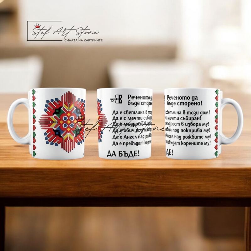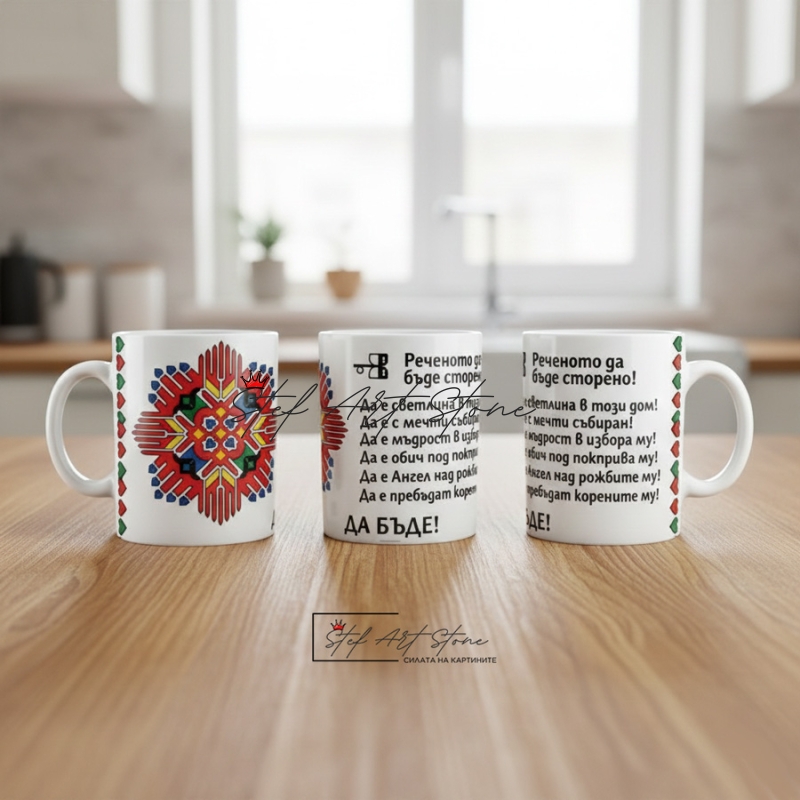 Тази керамична чаша с послание е върхът на нашата колекция от наричания. Тя не просто пожелава, тя утвърждава. Дизайнът е доминиран от внушителна Елбетица – соларният символ на българите, който излъчва енергия в четирите посоки на света, защитавайки дома от всяко зло.