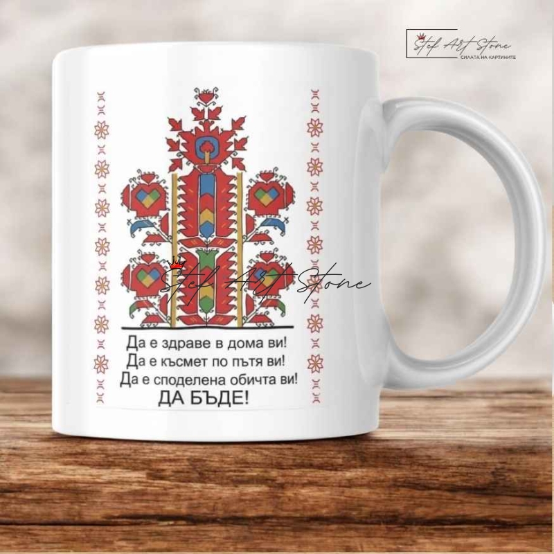 Тази уникална керамична чаша с послание съчетава красотата на фолклора със силата на словото. Моделът е вдъхновен от богатите и плътни македонски шевици, характерни със своите растителни орнаменти и наситени червени тонове, символизиращи жизнената сила и кръвта на рода.