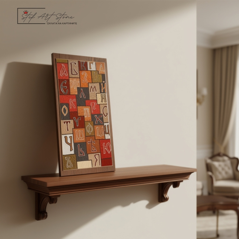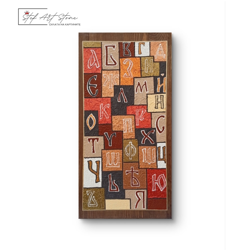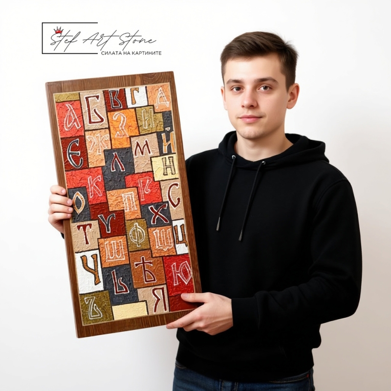 - 🎨 Ръчно изрисувана картина Кирилица върху дървена основа