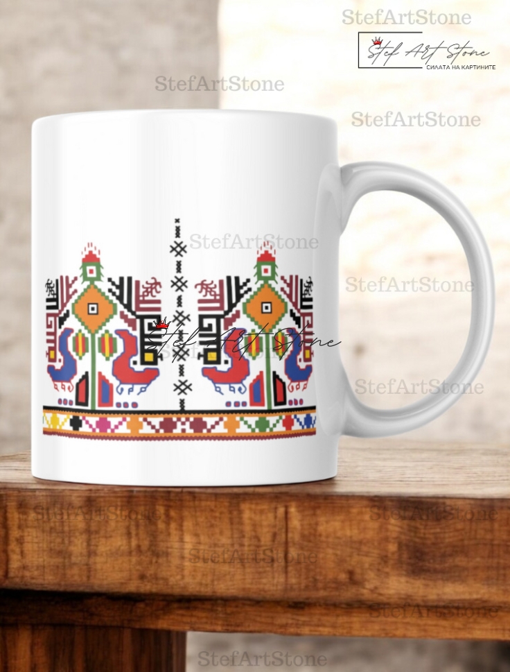 Тази висококачествена керамична чаша е повече от съд за кафе – тя е талисман. Декорирана с една от най-древните и силни български шевици, тя е създадена да носи хармония на трапезата.