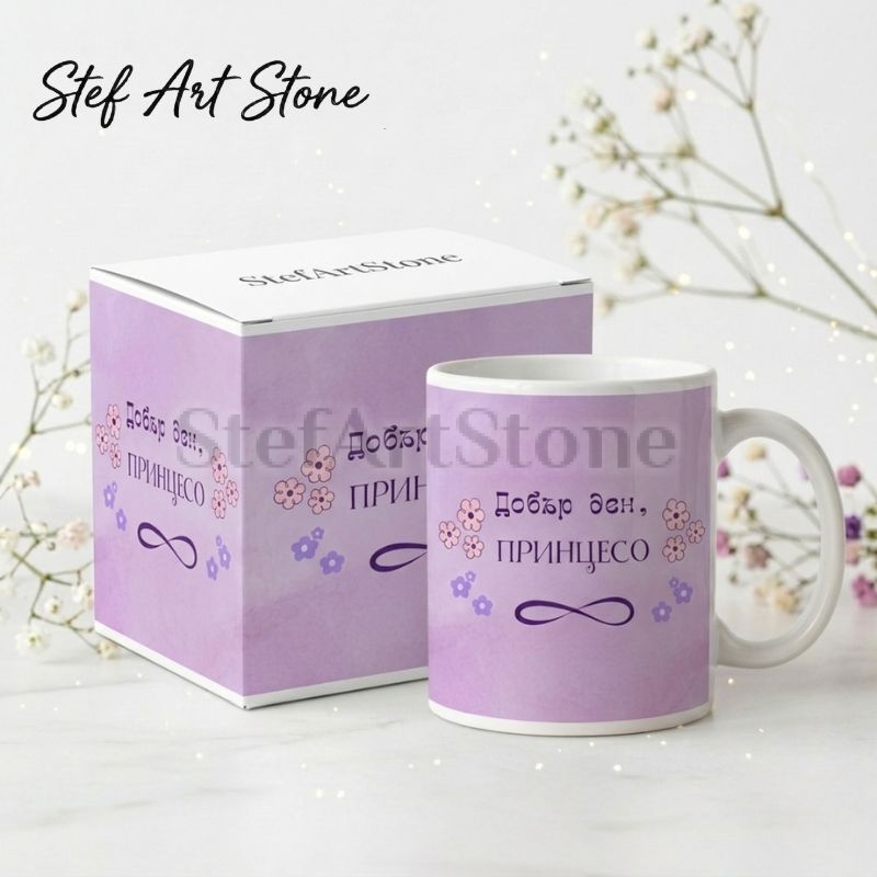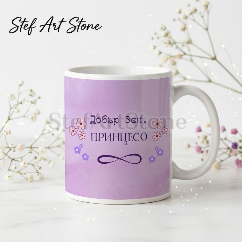 • Тип продукт: Висококачествена керамична чаша с нежен дизайн. • Вместимост: Стандартна 330 мл. • Материал: Бяла керамика отвътре, плътен цветен печат в лилаво отвън. • Дизайн: Пастелен лилав фон, елегантни цветни мотиви, знак за безкрайност и надпис "Добър ден, Принцесо". • Опаковка: Включена тематична подаръчна кутия, съобразена с дизайна на чашата.