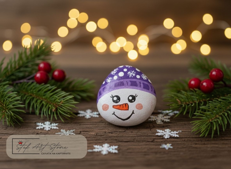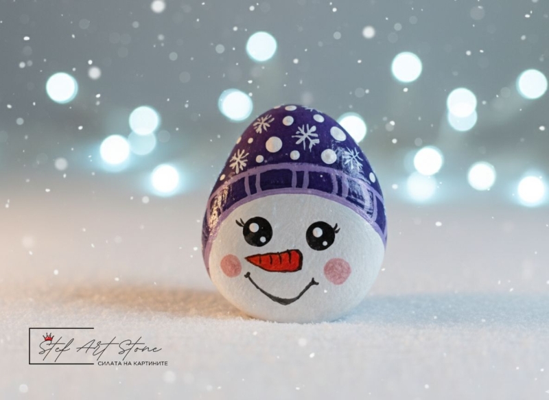❄️ Ръчно рисуван коледен камък „Снежен човек“ - магията на зимата в лилаво