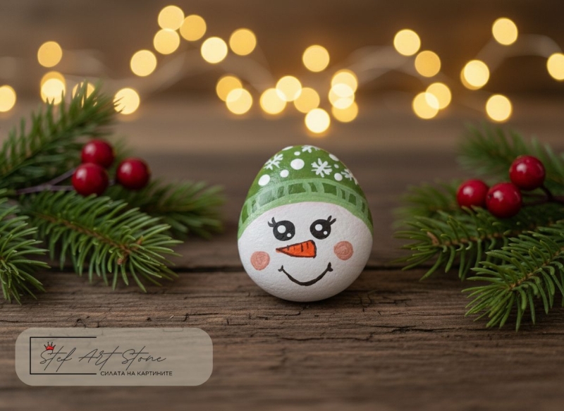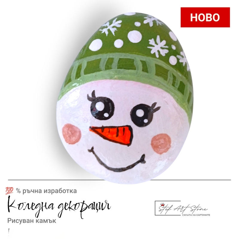 - 🎨 Ръчно рисуван камък с усмихнат снежен човек