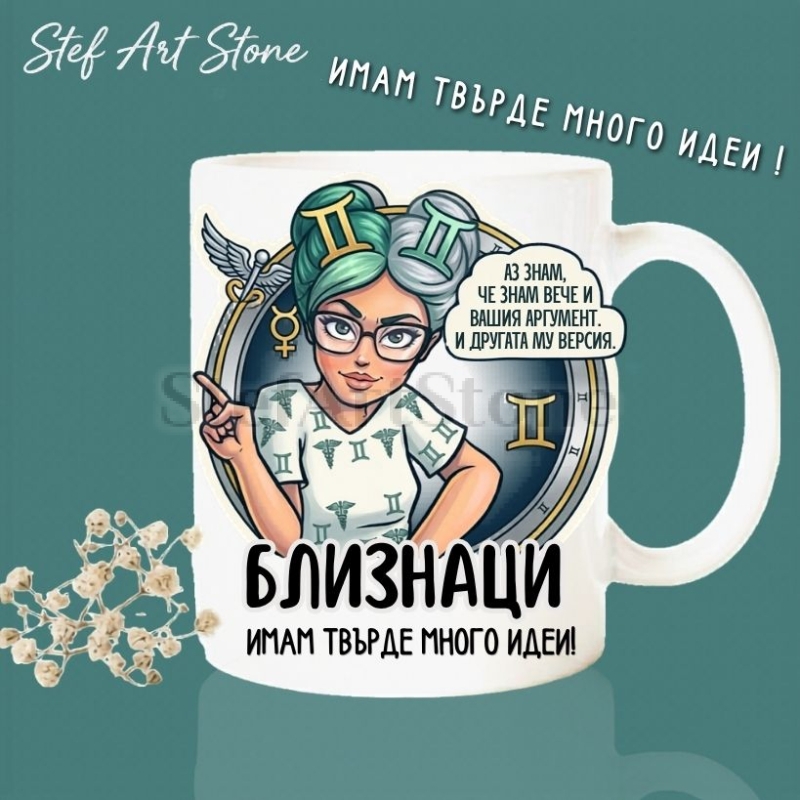 Тази красива чаша по поръчка представя забавна илюстрация на момиче с очила, което вече е обмислило всички възможни сценарии и гледни точки. Композицията е завършена от култовите реплики: АЗ ЗНАМ, ЧЕ ЗНАМ ВЕЧЕ И ВАШИЯ АРГУМЕНТ. И ДРУГАТА МУ ВЕРСИЯ. и абсолютно вярното признание БЛИЗНАЦИ - ИМАМ ТВЪРДЕ МНОГО ИДЕИ! Това превръща артикула в идеалната чаша за рожден ден за всяка дама, която обожава дискусиите, има отговор за всичко и печели всеки спор с лекота.