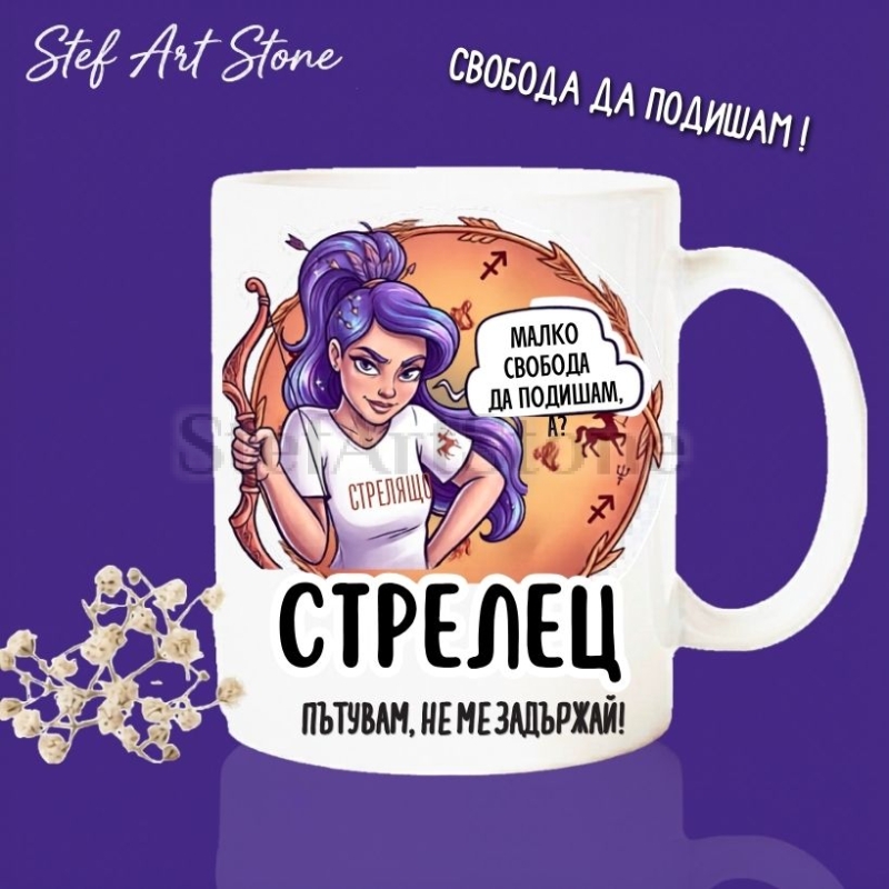 Чашата представя страхотна илюстрация на момиче с лилави коси, държащо лък, на фона на зодиакалния кръг и звездното небе. Композицията е завършена от култовите реплики: МАЛКО СВОБОДА ДА ПОДИШАМ, А? и категоричното СТРЕЛЕЦ - ПЪТУВАМ, НЕ МЕ ЗАДЪРЖАЙ! Това превръща артикула в идеалния подарък за всяка дама, която мрази рутината, живее за пътешествията и винаги търси нови хоризонти.