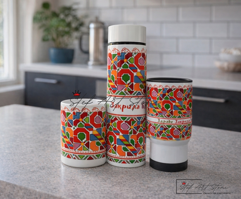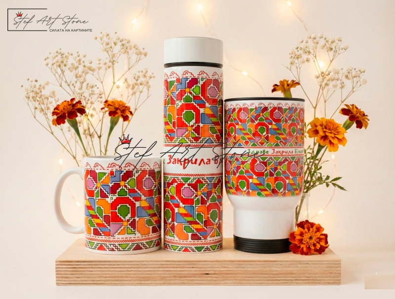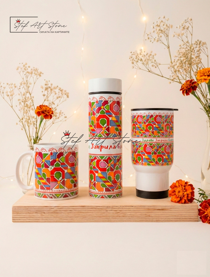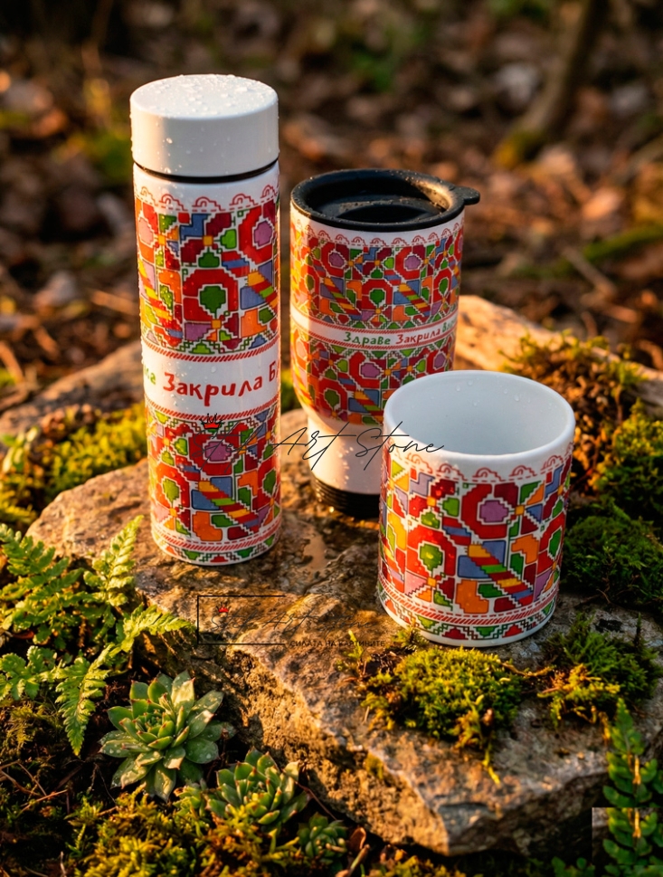 Пълен подаръчен комплект от 3 части: Термос с цедка (500 мл), Термо чаша за кола (500 мл) и класическа Керамична чаша. Всички продукти са с ярък дизайн на българска шевица и послание за "Здраве, Закрила и Благоденствие". Практичен и стилен избор за всекидневието или за подарък на чужденци.
