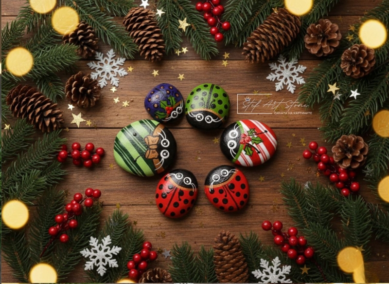 Този МАСТЪР Комплект от 6 Ръчно Рисувани Камъка Калинки е върхът на артистичността в коледната декорация!
