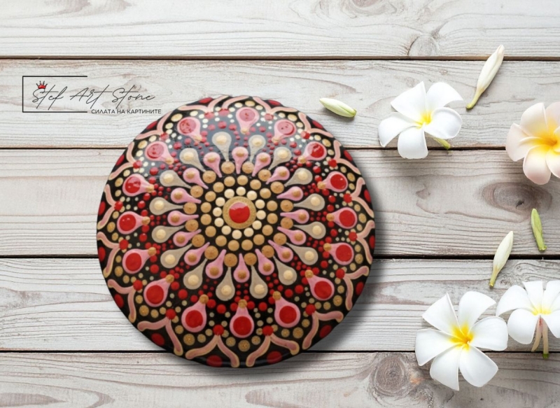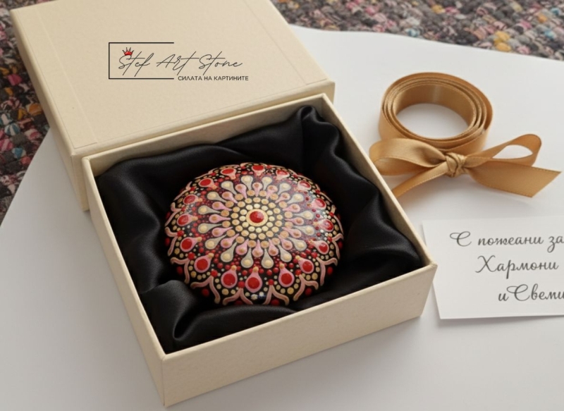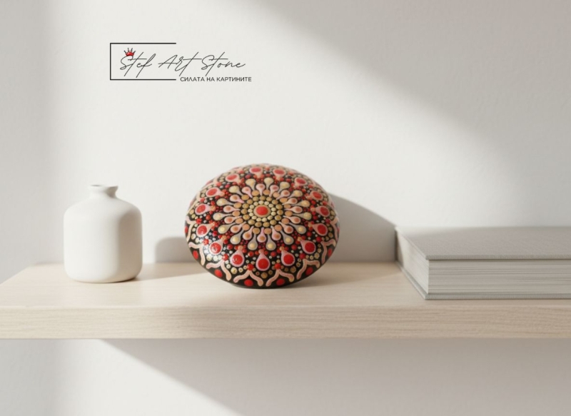 Почувствайте силата на червената и златна мандала, нарисувана върху плътен лят камък.