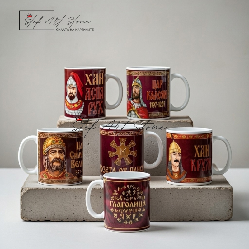 Луксозен мега комплект от 6 бордо чаши с български владетели и символи. Включва Аспарух, Крум, Симеон Велики, Калоян, Розетата от Плиска и Глаголицата. Дълбок бордо дизайн със златисти детайли. Представителен подарък с характер.