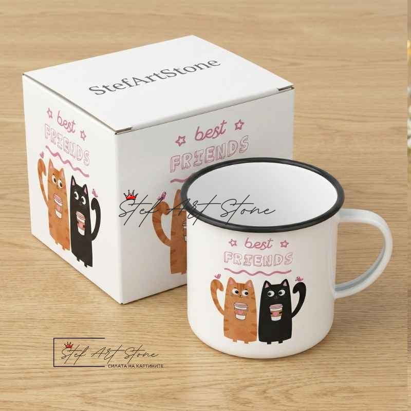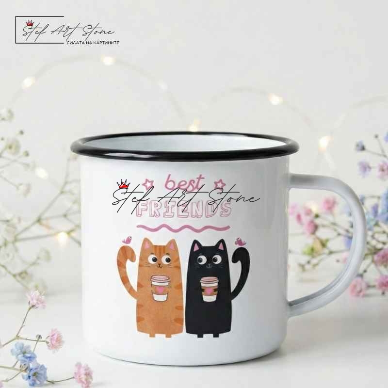 Здраво емайлирано канче за споделени моменти. Дизайнът е супер сладък – две котета (рижаво и черно) с чаши в ръце и надпис "Best Friends".