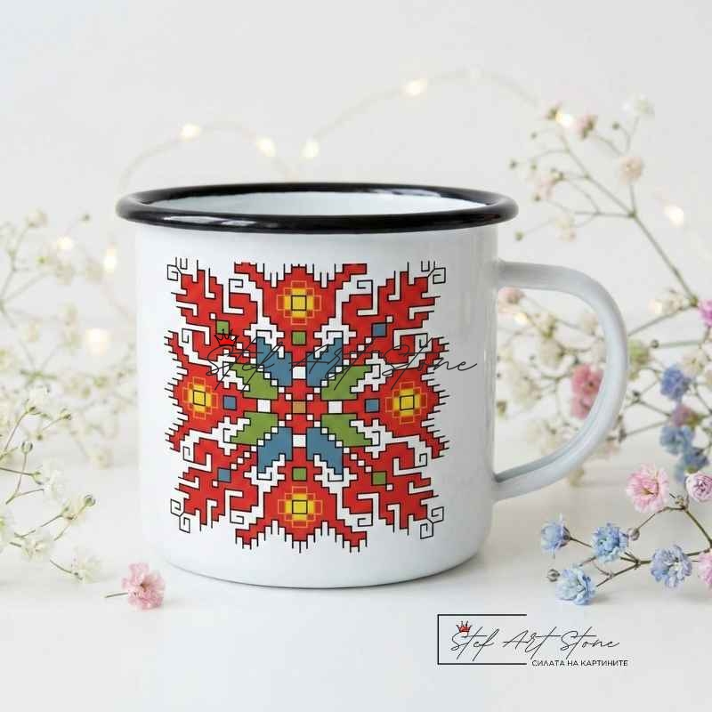 Емайлирано канче с един от най-силните български символи – Елбетицата. Дизайнът изобразява "Двойния кръст", олицетворяващ стабилност и хармония с природата.