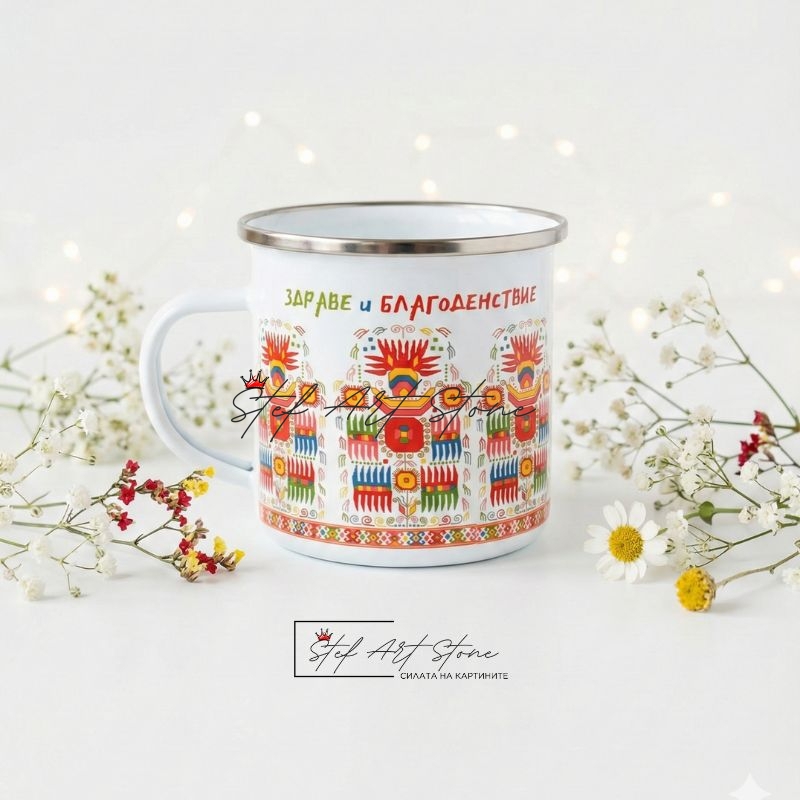 Здраво емайлирано канче с традиционна шевица от региона на Дупница. Дизайнът е с вертикални орнаменти и носи ясното послание "Здраве и Благоденствие".