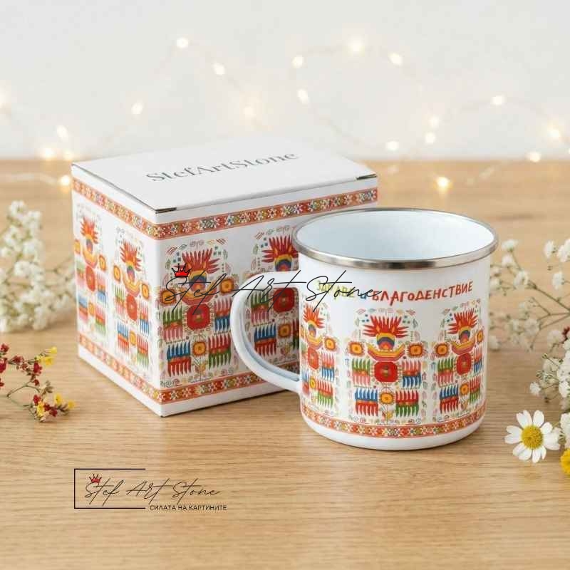 - 🎁 Готов подарък: Няма нужда да търсите хартия и панделки. Канчето идва в кутия, специално изработена за този модел – със същата шевица и надпис. Изглежда стилно и скъпо.