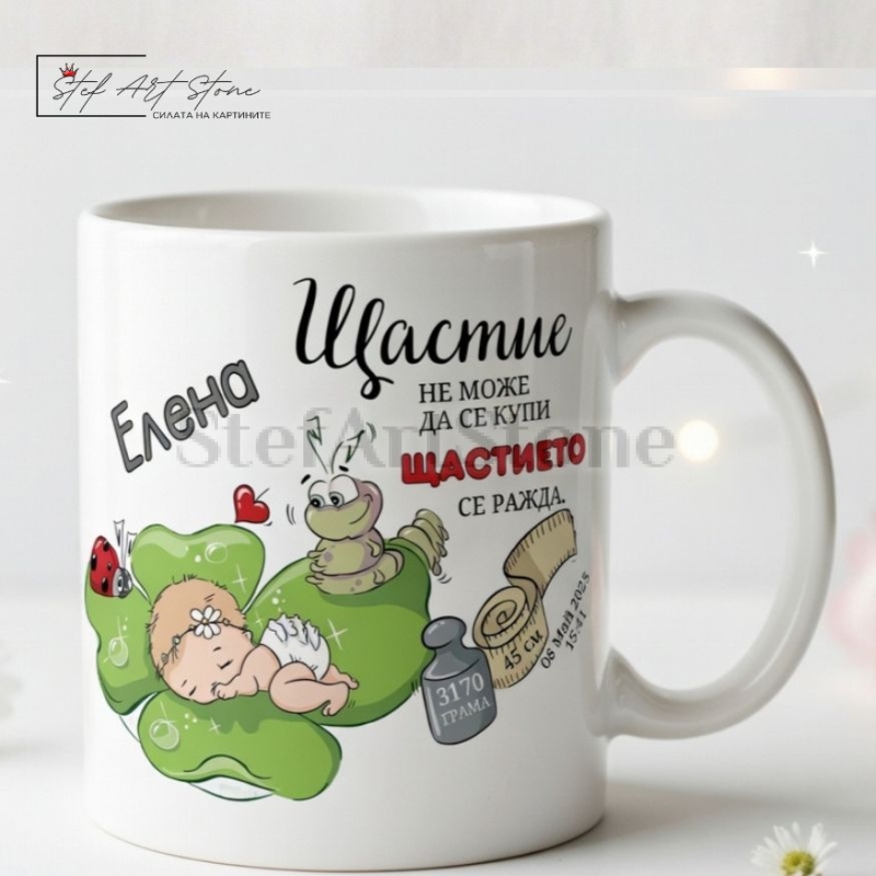 Дизайнът носи силно послание и символика. Върху чашата са изобразени прекрасни мотиви със спящо бебенце върху четирилистна детелина (вечният символ на късмета) и дълбокото послание: "Щастие не може да се купи. ЩАСТИЕТО се ражда.". Истинската стойност обаче идва с персонализацията – ние ще вградим личните данни на детето директно в илюстрацията. Теглото се изписва върху класическа тежест, а ръстът, датата и часът – върху навит шивашки метър. Заедно с името на детето, този жест става напълно уникален.