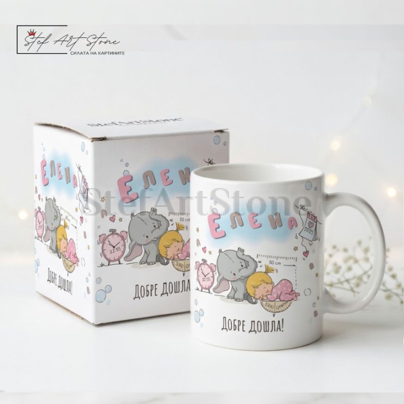 Дизайнът е изключително креативен и забавен. Върху чашата са изобразени прекрасни мотиви със спящо бебенце, сладко слонче и балончета. Но истинската магия се крие в детайлите! Ние ще вградим личните данни на вашето дете директно в илюстрацията – часът на раждане върху малък будилник, теглото върху ретро кантарче, ръстът до метърче и годината върху сладко календарче. Заедно с голямото име и надписа "Добре дошла!", този жест става напълно уникален.
