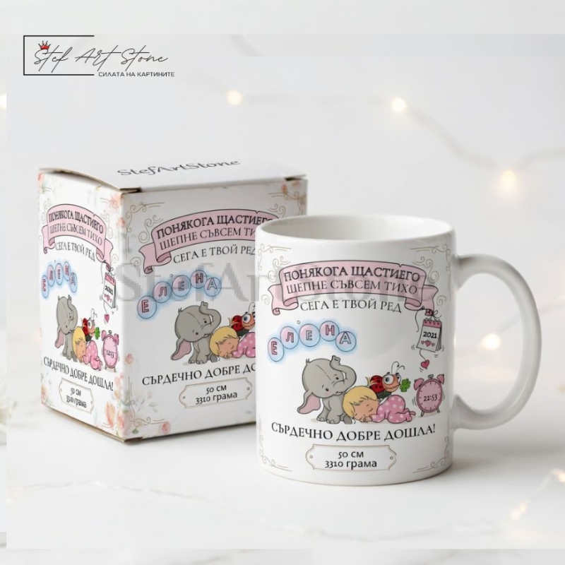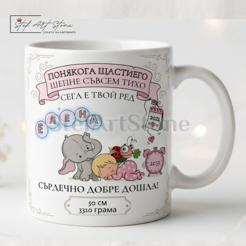 Дизайнът е изключително богат и емоционален. Върху чашата са изобразени прекрасни мотиви със спящо бебенце, слонче и калинка, увенчани от красивото послание: "Понякога щастието шепне съвсем тихо. Сега е твой ред". Но истинската магия се крие в детайлите! Ние ще вградим личните данни на вашето дете директно в илюстрацията – часът на раждане върху малък будилник, датата върху календарче, а теглото и ръстът в специален елегантен банер на дъното. Заедно с името в забавни балончета и надписа "Сърдечно добре дошла!", този жест става напълно уникален