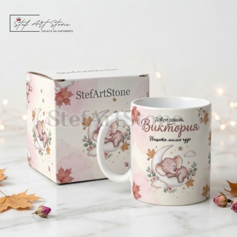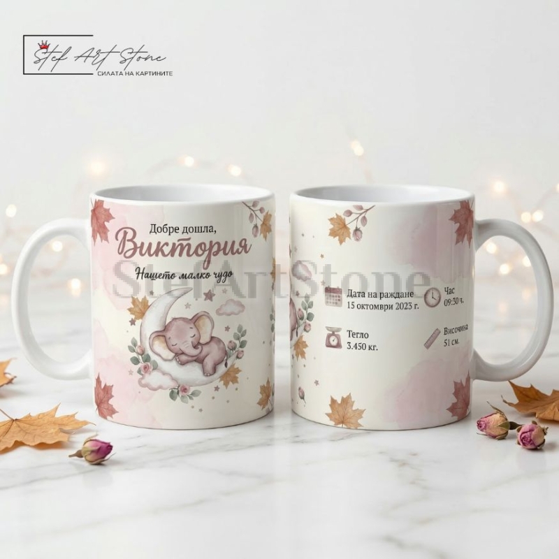 Дизайнът е създаден с много нежност и любов. Върху чашата са изобразени красиви мотиви със спящо слонче, луна и ефирни облачета. Но това, което превръща този продукт в безценен жест, е пълната му персонализация. Ние ще вградим името на момиченцето и нейната първа лична "визитка": точната дата и час на раждане, теглото и ръста.