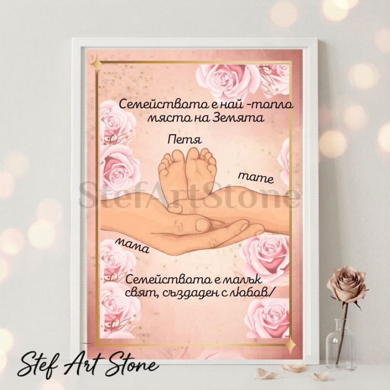 Визията е изключително нежна и въздействаща. Родителските ръце, които пазят малките бебешки крачета, са нежно обгърнати от красиви розови цветове. Посланието утвърждава това, което всички знаем – че семейството е най-топлото място на Земята. С добавянето на вашите лични имена, този изящен дизайн се превръща в безценен спомен и уникална семейна реликва.