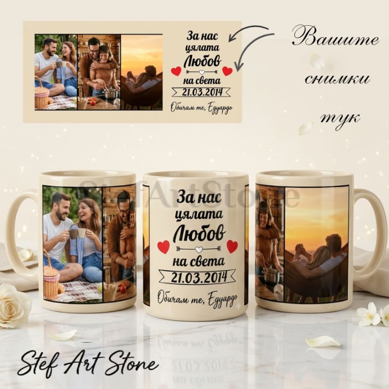 Съхранете Вашата обща история с тази изключително стилна персонализирана чаша. Дизайнът се отличава с меки, топли нюанси и съчетава перфектно място за три Ваши любими кадъра с централно романтично послание: "За нас цялата Любов на света".
