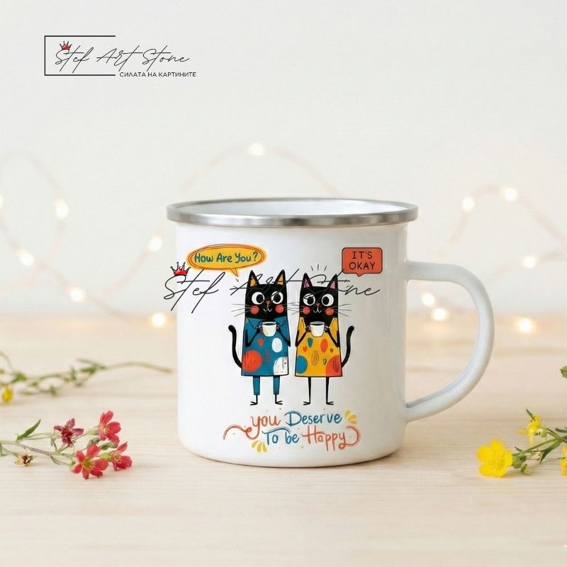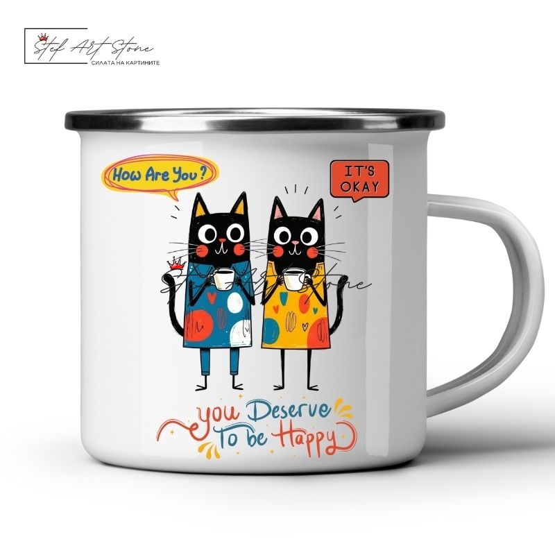 Метално Канче "Щастие и Котки" – You Deserve To Be Happy (Емайлирано)