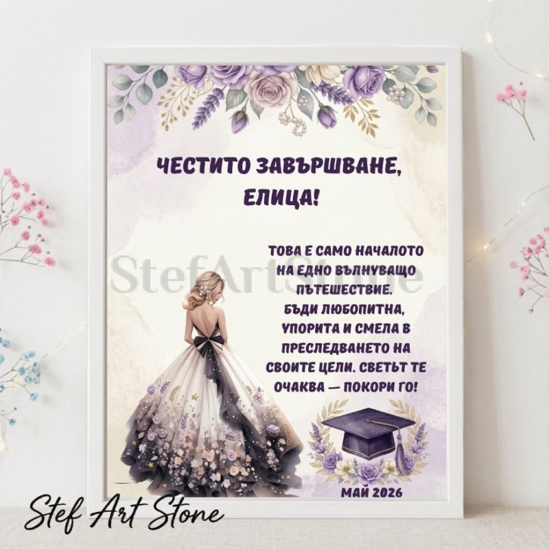 Дизайнът се отличава с изящна визия в нежни лилави тонове. Илюстрацията на момичето във впечатляваща рокля, съчетана с академичната шапка и красивите флорални елементи, създава перфектния баланс между празничност и академичен успех. Вдъхновяващото пожелание напомня да бъде смела и упорита по пътя напред. Добавянето на нейното лично име и датата на завършването превръща този арт принт във високо ценен, личен спомен.