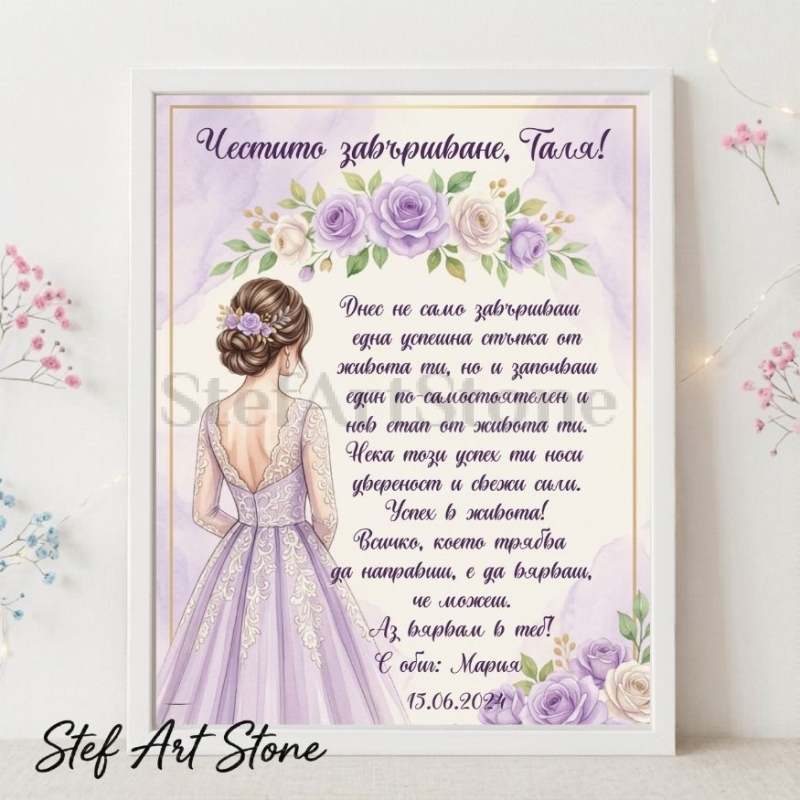 Завършването е не просто празник, а емоционален преход към един напълно нов, самостоятелен етап от живота. Този елегантен персонализиран постер с рамка е създаден, за да изрази най-съкровените ви чувства и пожелания към младата дама по изключително красив начин.