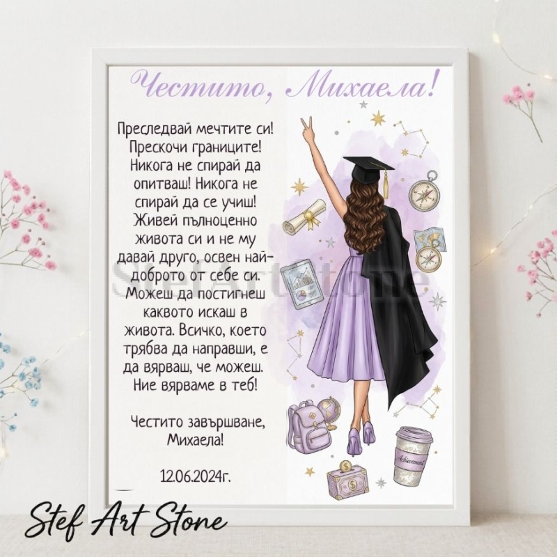 Завършването е моментът, в който пред всяка млада жена се откриват безброй възможности. Този персонализиран постер с рамка е идеалният подарък за абитуриентка или дипломантка, създаден да ѝ вдъхне увереност и смелост по пътя към върха.