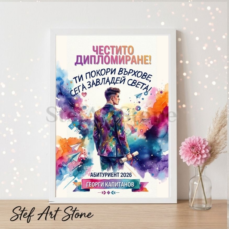 Дизайнът е създаден с мисъл за бъдещите победители. Акварелната експлозия от цветове обгръща силуета на младежа с диплома в ръка, създавайки усещане за енергия и неограничени възможности. Посланието "Ти покори върхове, сега завладей света!" му дава увереност за новия етап от живота му. Като добавим неговото име и випуск в долната част, този арт принт се превръща в дълбоко личен жест на признателност за неговия труд.