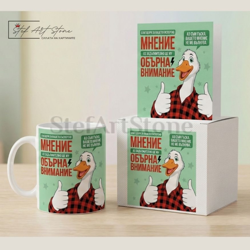 Сетът включва страхотна чаша с надпис, тематична картонена кутия и стилна подаръчна картичка (размер 14х14 см). Дизайнът е абсолютен хит – главен герой е изключително доволна гъска, която показва палци нагоре, придружена от най-добрия възможен отговор за "експертни съвети": "БЛАГОДАРЯ ЗА ВАШЕТО ЕКСПЕРТНО МНЕНИЕ АЗ ЗАДЪЛЖИТЕЛНО ЩЕ МУ ОБЪРНА ВНИМАНИЕ. Аз съм гъска. Вашето мнение не ме вълнува.".