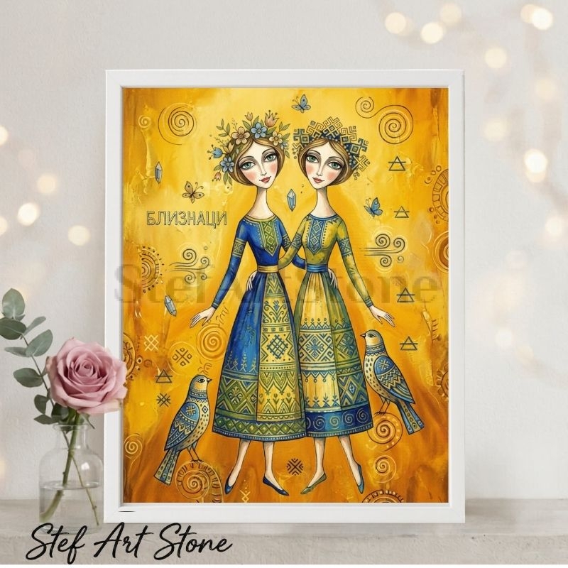 Всяка въздушна натура заслужава своя оригинален подарък! Тази невероятна картина постер в рамка улавя изцяло същността на зодия Близнаци. Дизайнът прелива от слънчеви златисто-охрени тонове и наситено синьо, символизиращи неизчерпаемата енергия, свободолюбивия дух и интелекта на този астрологичен знак. Двете грациозни фигури с красиви етно мотиви излъчват хармония и комуникативност, а детайлите като птиците, флоралните венци и мистичните орнаменти превръщат този постер в истинско произведение на изкуството.