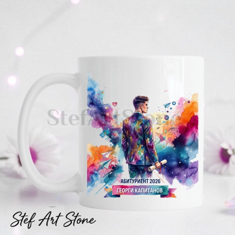 Дизайнът е смел и артистичен. Илюстрацията на младежа в костюм, устремен към цветната експлозия от бъдещи идеи и успехи, прави тази чаша много по-различна от стандартните сувенири. Възможността да добавите конкретен випуск и две имена я превръща в ексклузивен артикул, създаден специално за него.