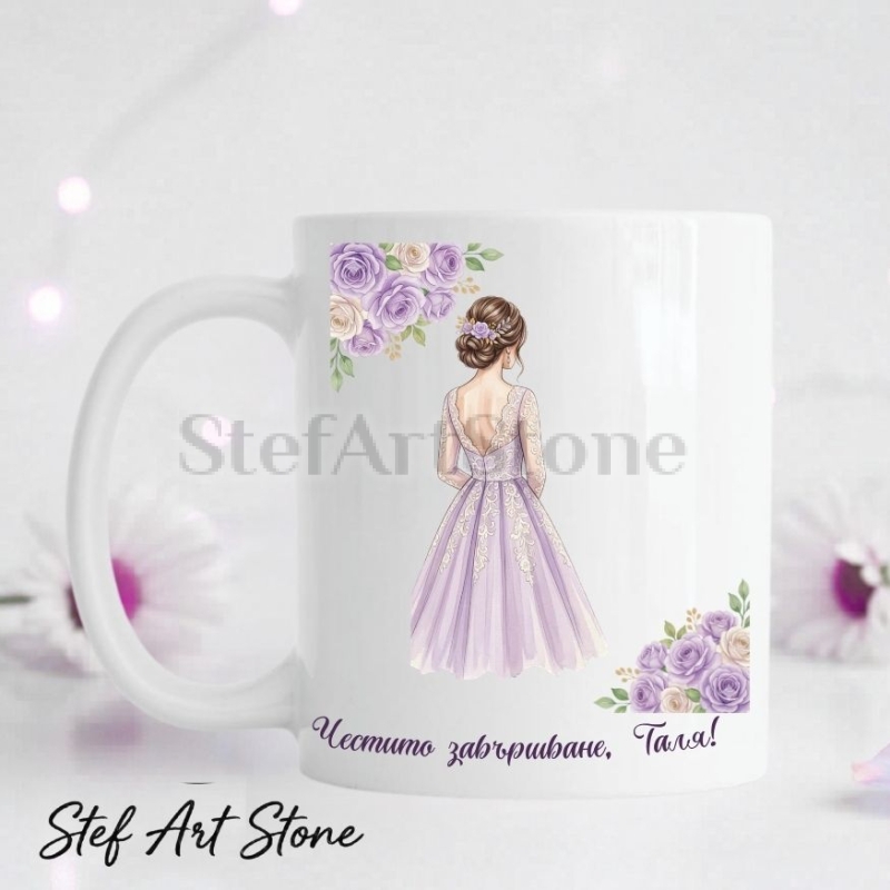 Дизайнът пленява със своя финес и внимание към детайла. Илюстрацията на младата дама в елегантна лилава рокля с дантелен гръб, нежно обградена от красиви рози, улавя усещането за истинска класа. Добавянето на лично име към сърдечното пожелание "Честито завършване!" превръща тази чаша във високо ценен, персонален спомен, който ще я радва дълги години.