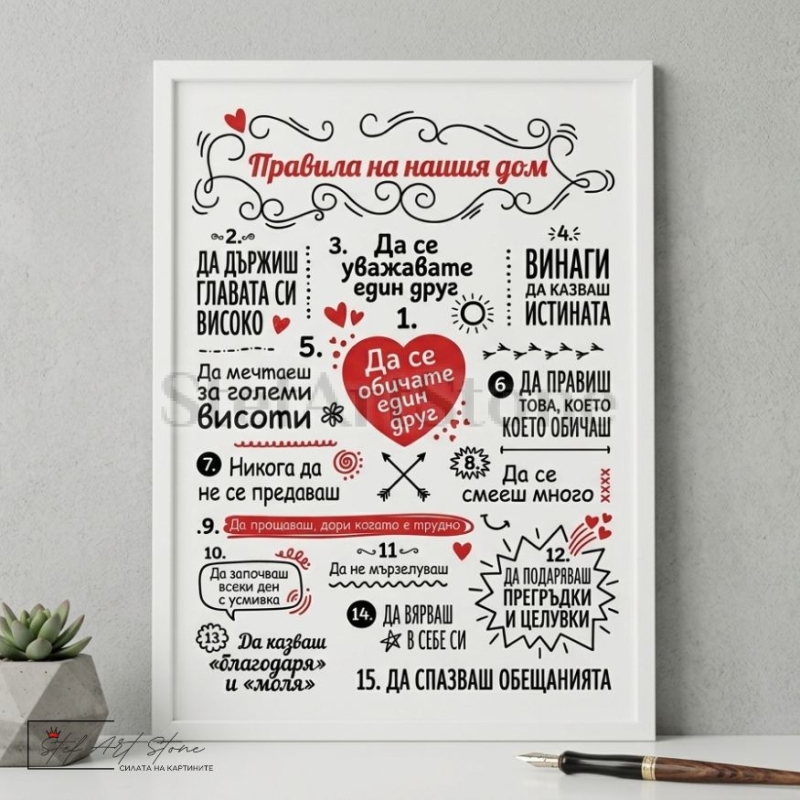Търсите ли начин да запечатате най-важните семейни ценности в една красива картина? Този персонализиран постер с рамка "15 Правила на Нашия Дом" е създаден да носи вдъхновение и топлина. Ако искате да направите оригинален и значим подарък за семейство, младоженци или за собствения си нов дом, този детайлен дизайн е идеалното решение.