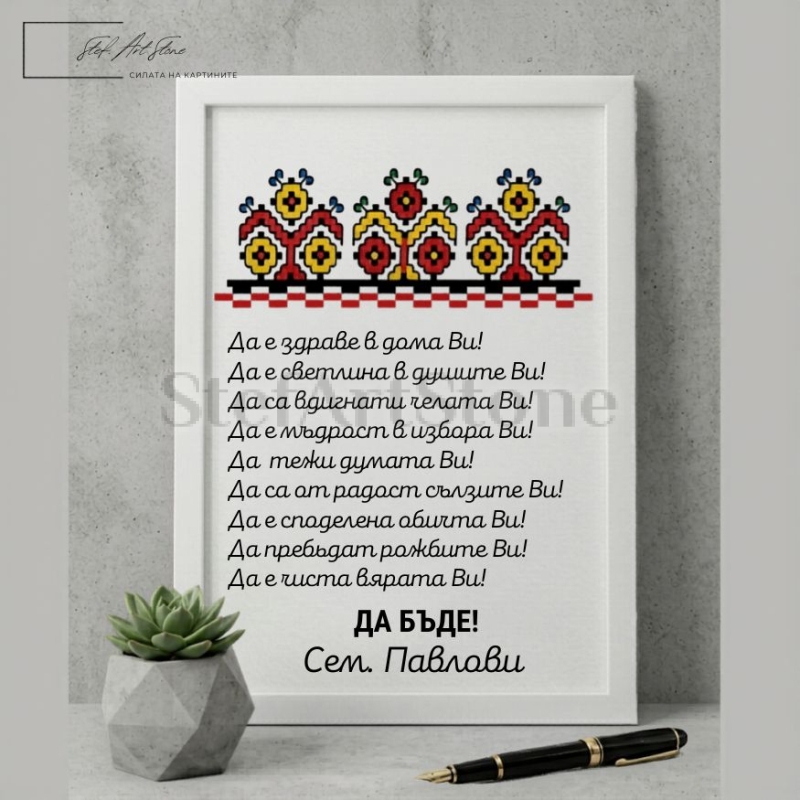 Дизайнът съчетава изчистена визия и ярки фолклорни мотиви, които оживяват на стената. Всяко от пожеланията – от здравето в дома до чистата вяра – е като магическо заклинание за благоденствие. А добавянето на вашата фамилия в долната част превръща този постер в истинска семейна реликва, която ще се пази с поколения.