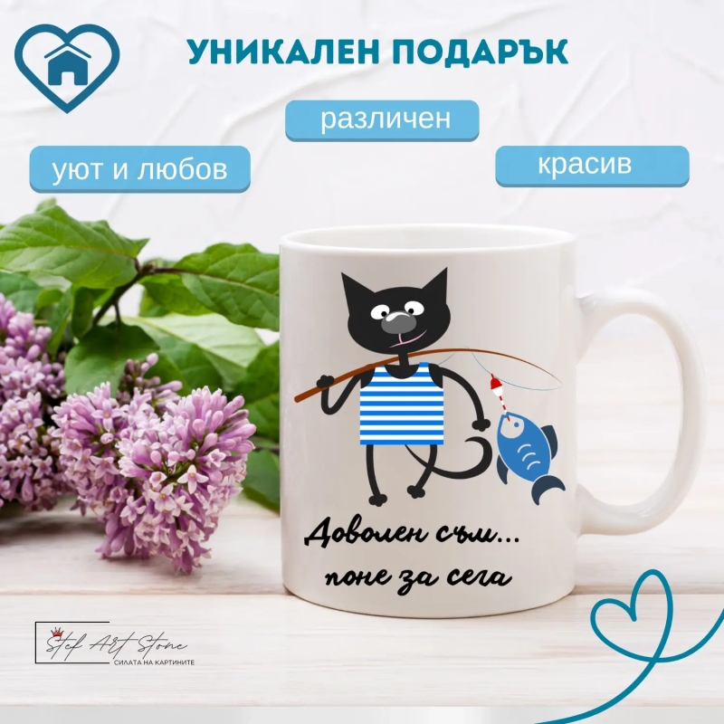 Чашата с надпис „Доволен съм, поне за сега“ е създадена за хора с чувство за хумор и положителен поглед върху живота. Със своя стилен и минималистичен дизайн, тя е подходяща за всеки дом или офис, внасяйки нотка свежест и настроение.