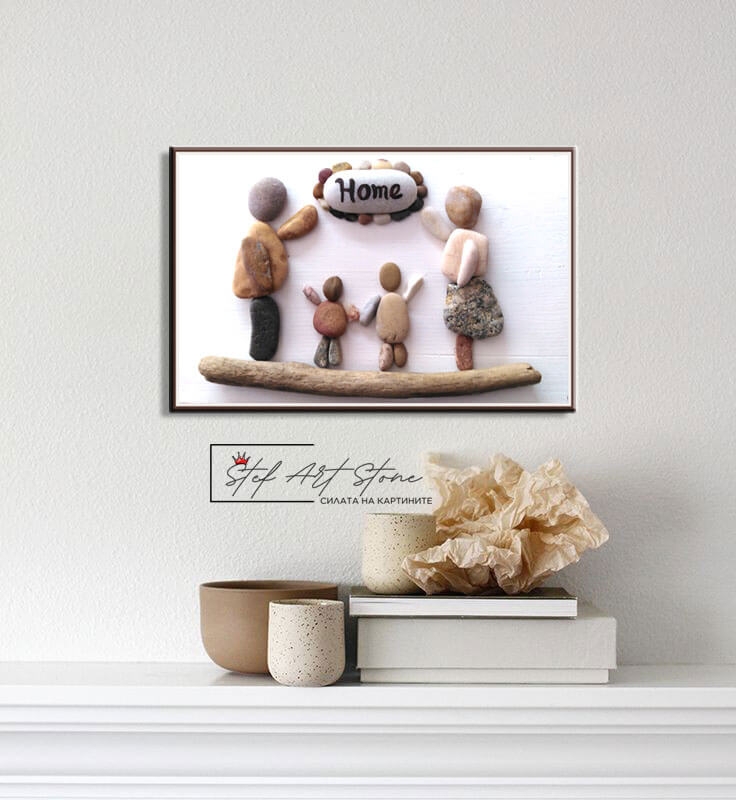 Ръчно изработено декоративно пано с морски камъни, което изобразява семейна хармония.