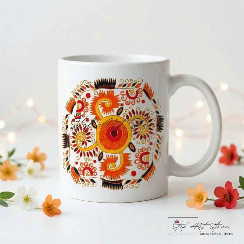 Керамична чаша с българска шевица „Слънце за здраве и благоденствие“ | Чаши Български Шевици