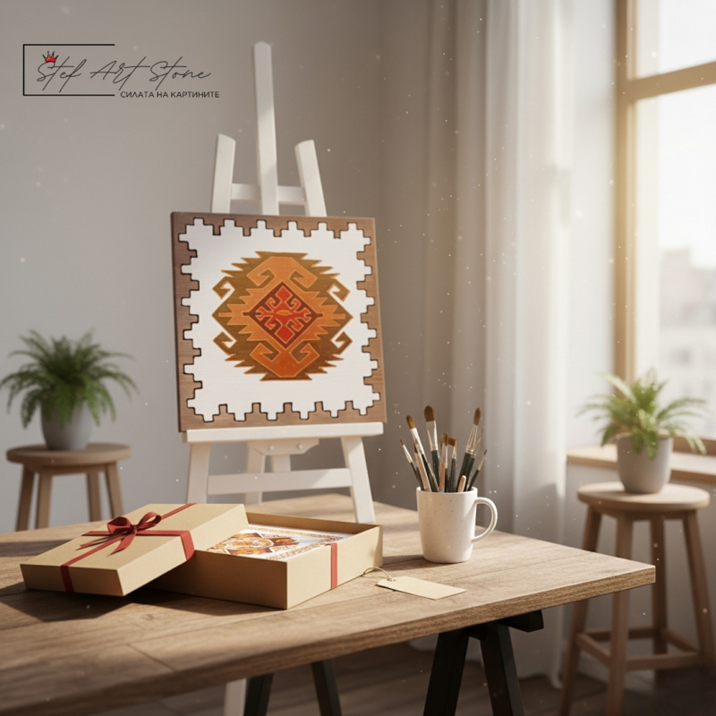 Картината е готова за окачване и е опакована в кутия, което я превръща в идеален подарък за специален повод - юбилей, нов дом, сватба, имен ден или просто жест към човек, който цени българските традиции и ръчното изкуство.