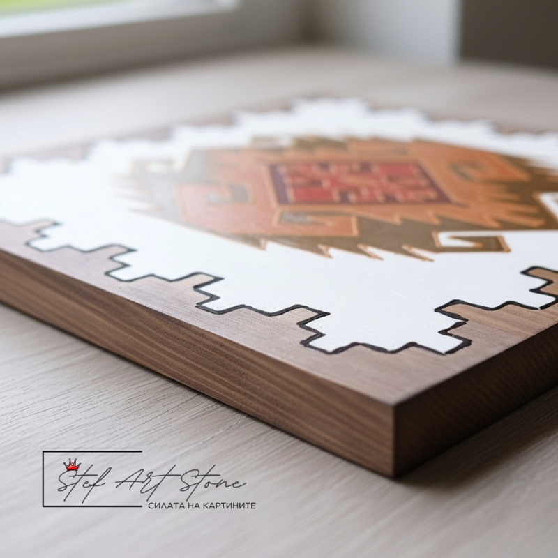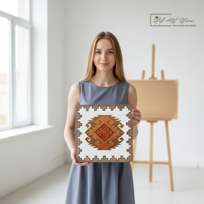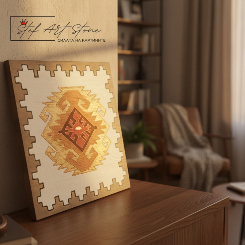Тази ръчно рисувана картина пресъздава мотив от чипровски килим - едно от най-ценните богатства на българското културно наследство. Всяка линия и форма е внимателно изрисувана с акрилни бои върху дървена основа, за да създаде усещане за топлина, традиция и хармония.